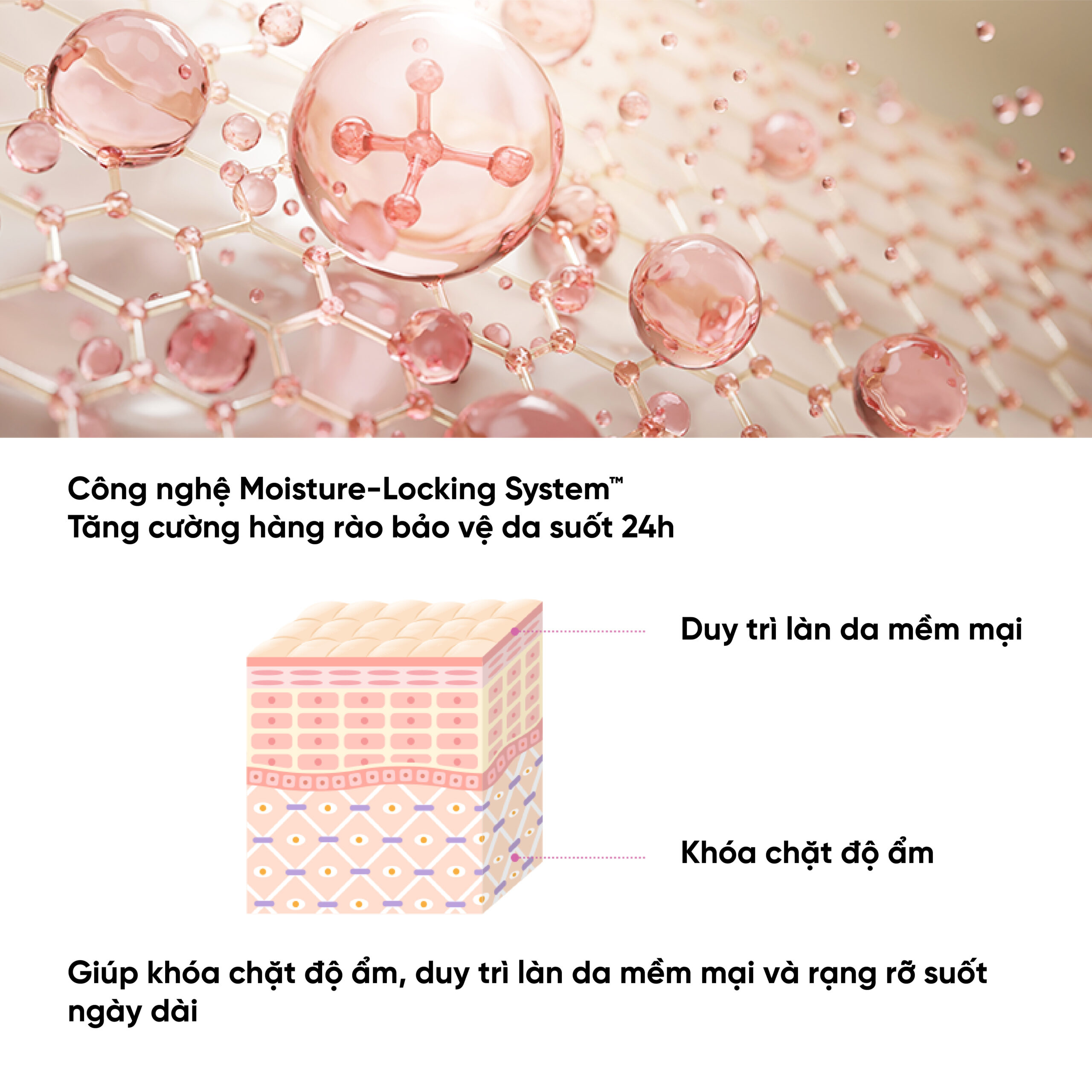 Công nghệ Moisture-Locking System™ giúp khóa chặt độ ẩm, duy trì làn da mềm mại và rạng rỡ suốt ngày dài.